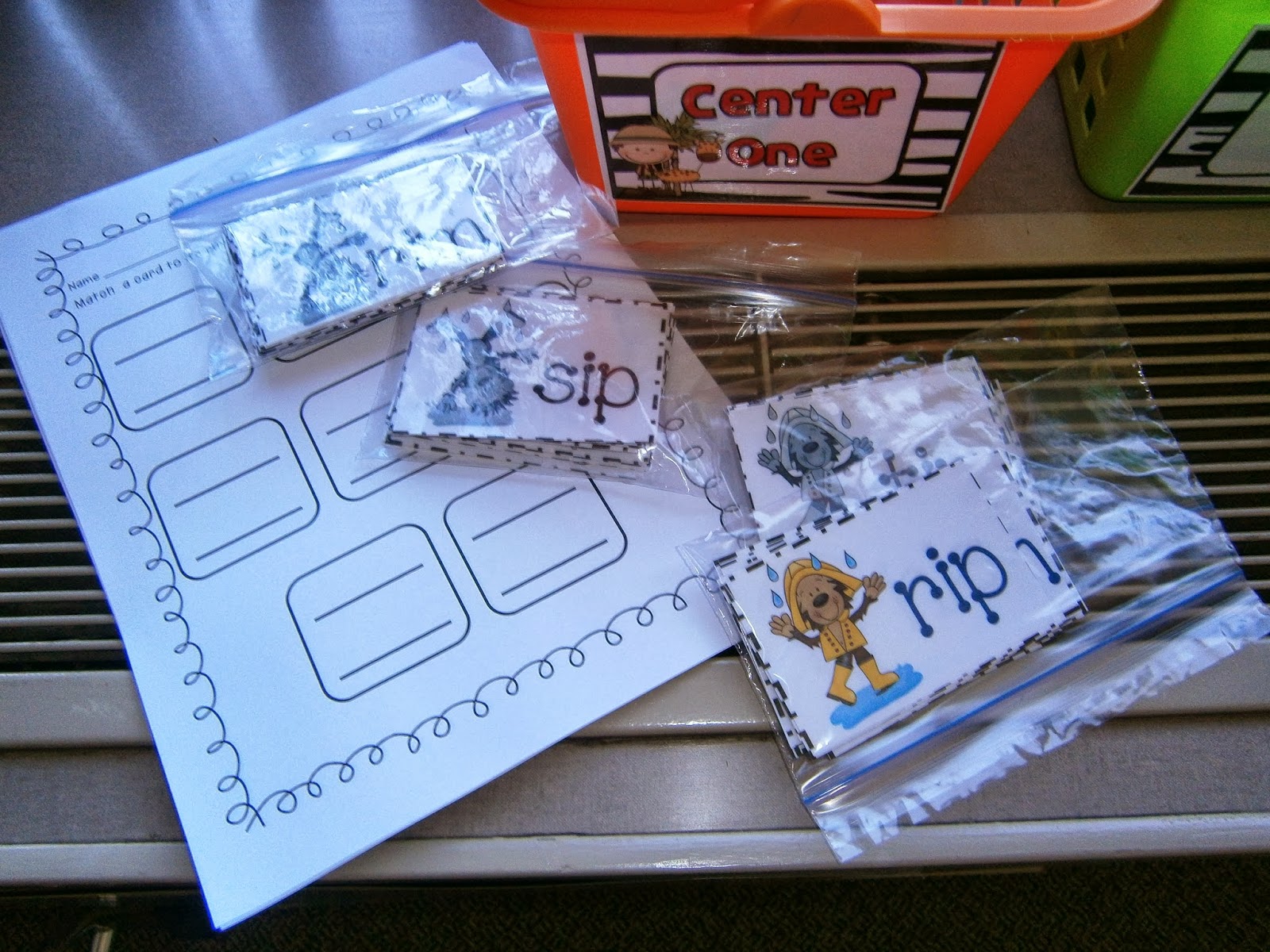 Here is a close up of word cards and record sheets for rhyming word centers.